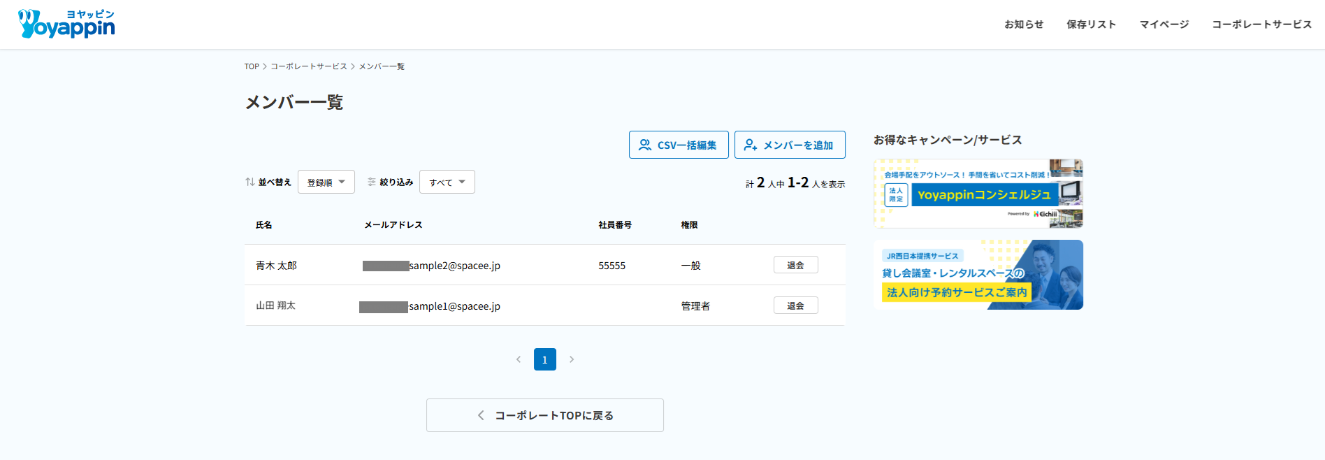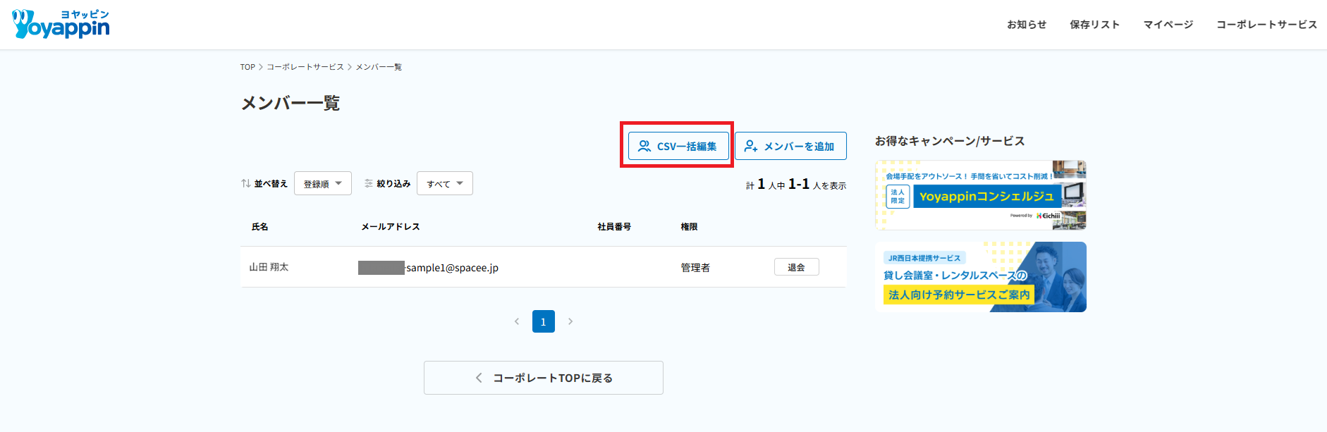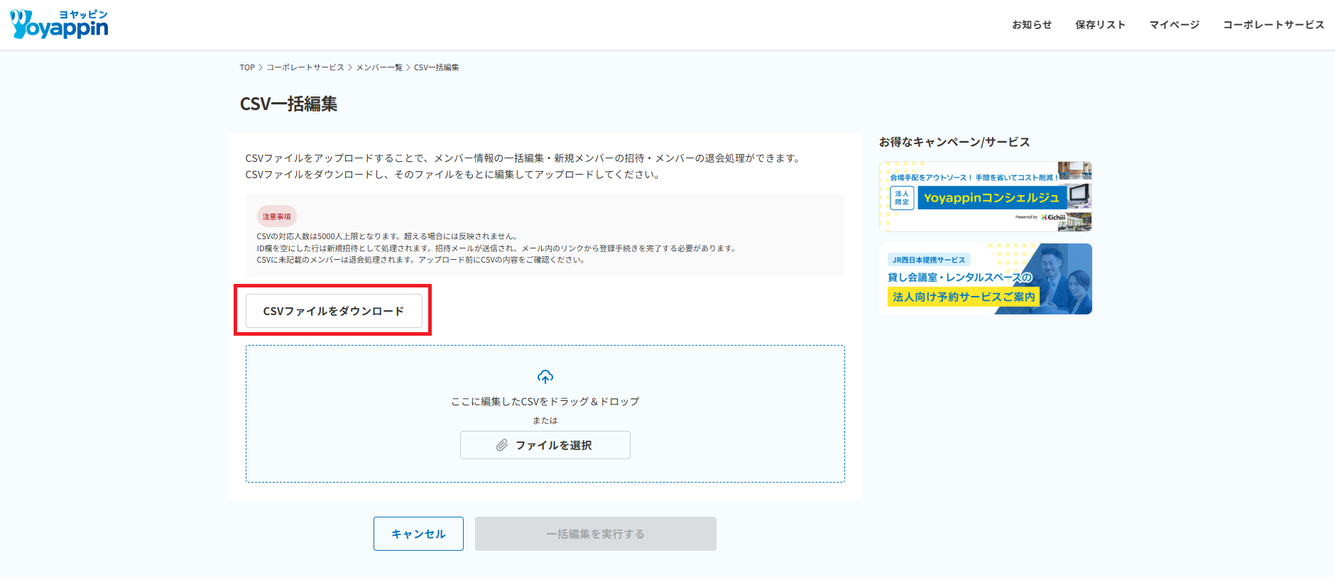 1. コーポレートサービス>メンバー管理にて「CSV一括編集」をクリック