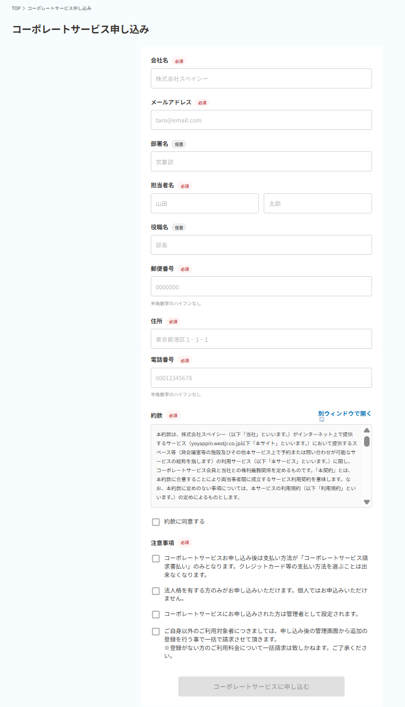 ③ 情報を入力後、「約款に同意する」にチェックを入れ、「コーポレートサービスに申し込む」ボタンを押下してください。