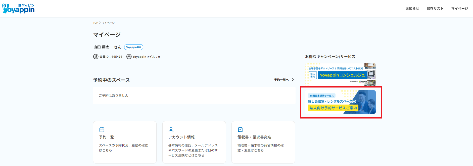 ① ログイン後、マイページにある「法人向け予約サービスのご案内」バナーをクリックします。