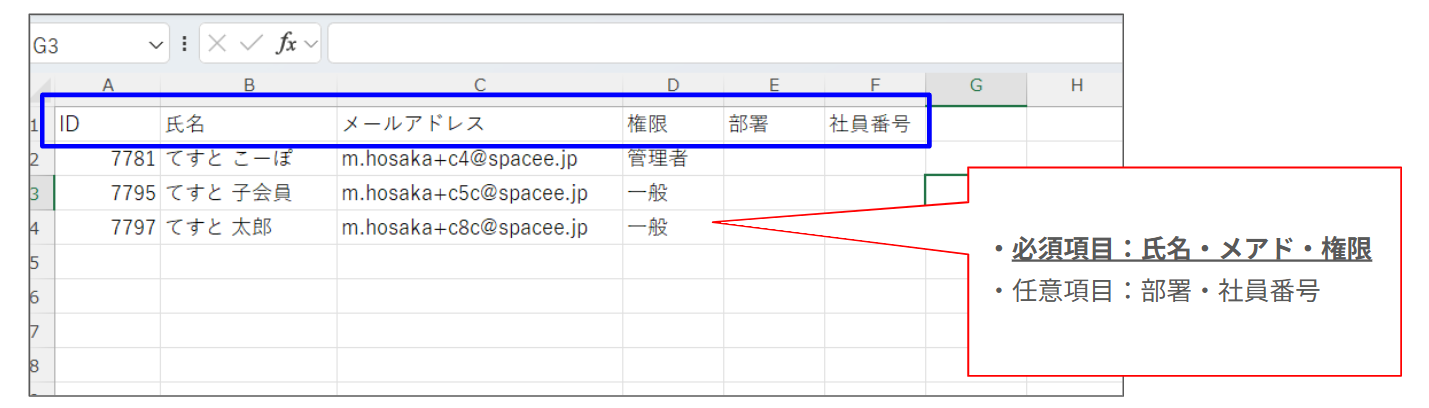 ⑤*権限(メンバーor管理者) [* メンバー]or[* 管理者]以外の文字は正しくデータを取り込めません。